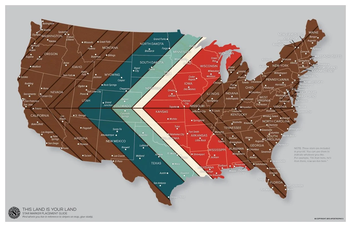 Folk art map of the U.S. Concept collaboration with Haylee Larson. Designed, engineered, sourced, and manufactured. Star accessory placed by maker on location where home is (geographic reference guide was provided to assist with placement).